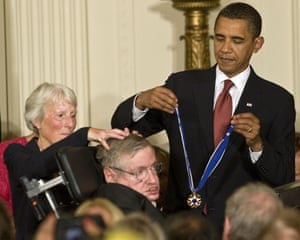 Pictures from the academy’s archives show the Pope kneeling before Hawking, who was seated in a motorized wheelchair, to present him with the medal and touch his head. [8]